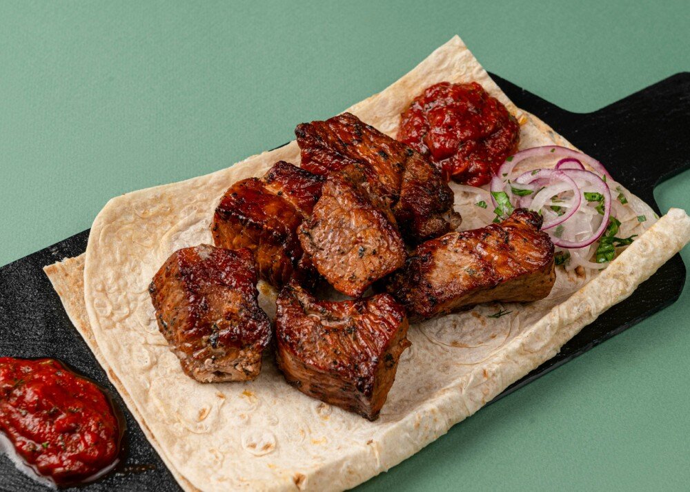 Подаётся с маринованным луком, соусом шашлычным(40г.), порцией лаваша.