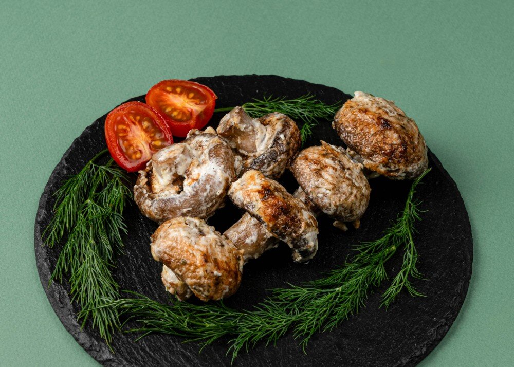 Шампиньоны в сливочном соусе, приготовленные на углях