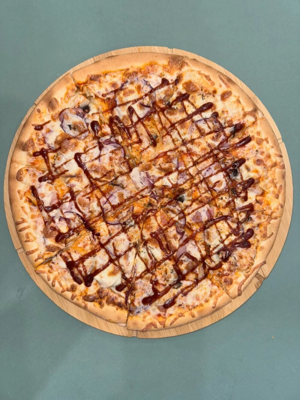 Мясо курицы, бекон, сыр моцарелла, шампиньоны, лук красный, соус томатный, соус барбекю, тесто.