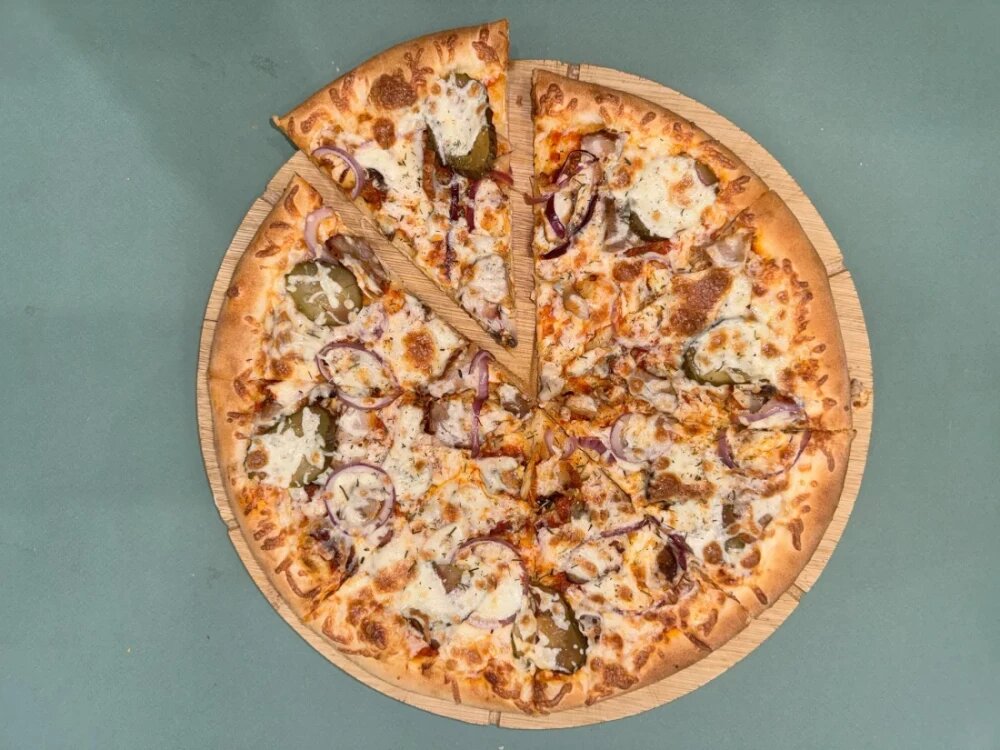 Сыр моцарелла, соленые огурцы, лук красный, шампиньоны, свинина, соус томатный, тесто