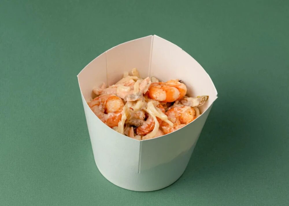Лосось, креветки, перец болгарский, лапша, огурец, лук, чеснок, сливочный соус