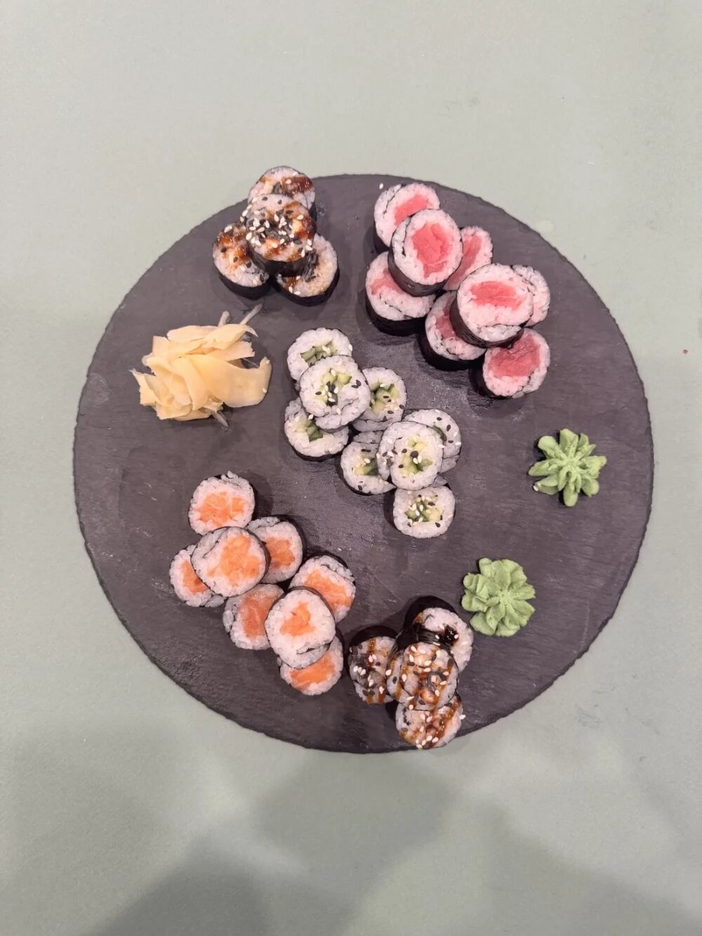 3 соевых соуса. Ролл «Каппа маки», ролл «Лаки Сяке», ролл «С тунцом», ролл «Унаги маки»