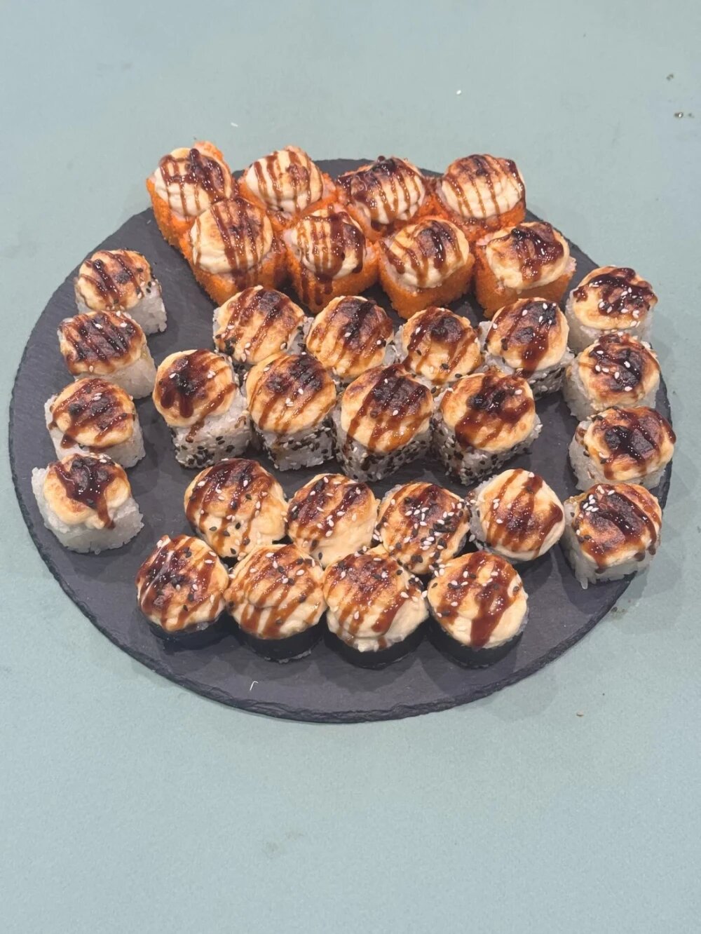 3 соевых соуса. Ролл «С лососем», ролл «Калифорния», ролл «С рисом», ролл «С кунжутом»