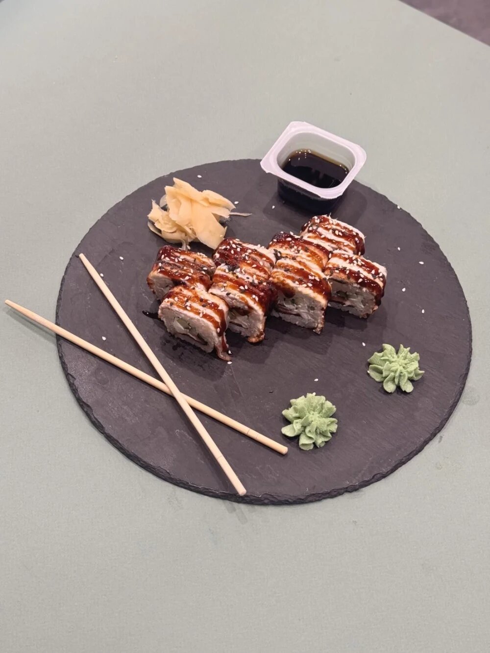 Рис, нори, сыр, огурец, лосось, нарезка угря, соус унаги, кунжут.