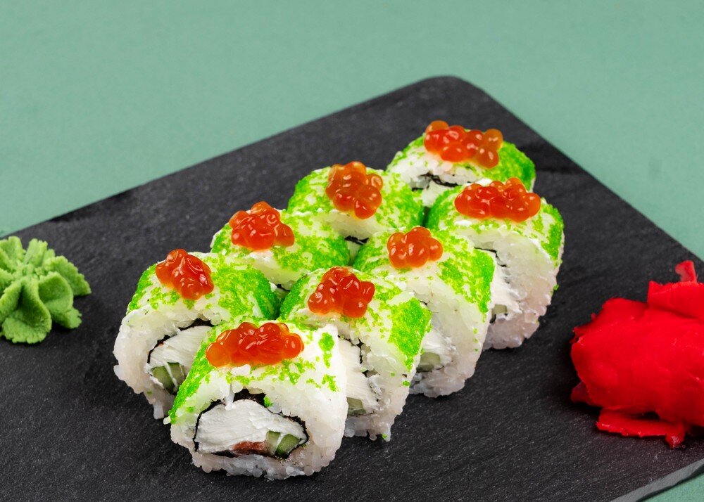 Рис, нори, сыр, лосось, икра, зелёная икра тобико.