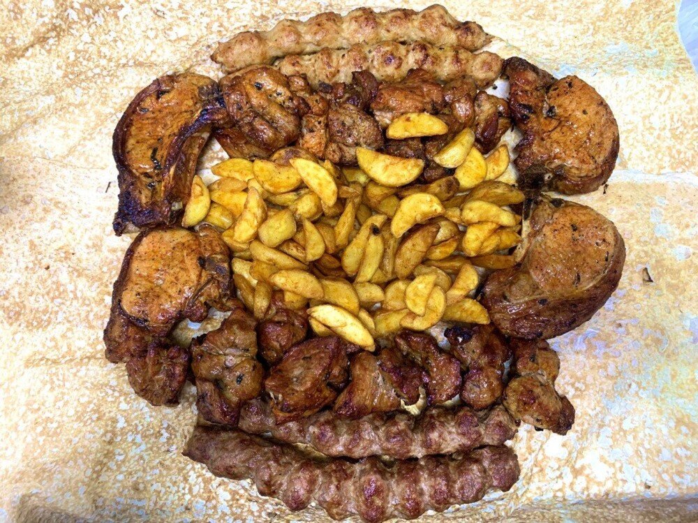 4 порции свиной шеи, 2 порции свинины на ребре, 2 порции люля куриных, 2 порции люля говяжий, 3 порции картофеля по-деревенски. Подаётся с маринованным луком, 4 больших шашлычных соуса, с лавашом.
