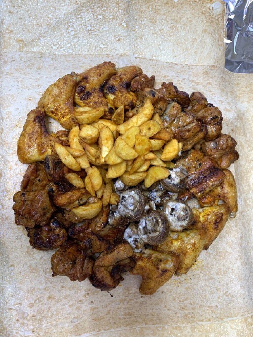 2 порции свиной шеи, 2 порции рёбрышек, 2 порции шампиньоны на мангале , 2 порции крыльев куриных, 2 порции картофеля по-деревенски.Подаётся с маринованным луком, 2 больших шашлычных и 1 чесночный соус, лавашом.